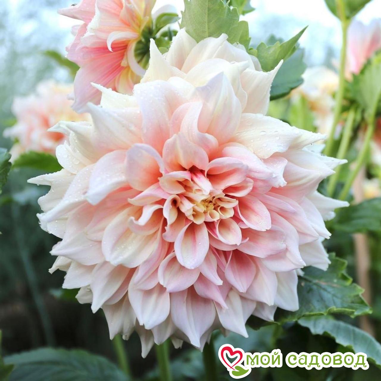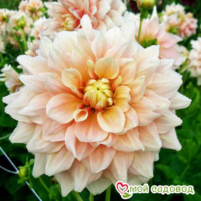 У георгины прямостоячие и прочные стебли, которые хорошо поддерживают распускающиеся цветы. В высоту они достигают 90 см. Листья насыщенно-зеленые. Они крупные, глянцевые и имеют гладкую поверхность. Основное внимание привлекают пышные соцветия. Цветки крупные, густомахровые, диаметром 25 – 30 см. Лепестки окрашены в светло-оранжевый, бело-розовый или желтый оттенок. Цветет сорт в течение всего сезона, начиная с летних месяцев и продолжая до глубокой осени.